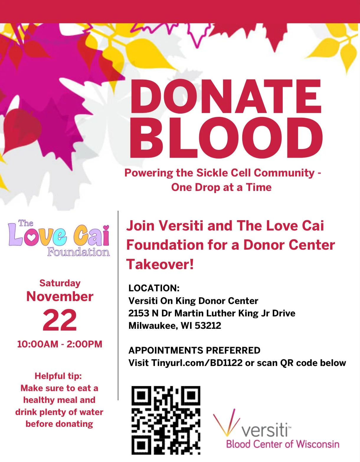Where: Versiti on King 2153 N. Dr. Martin Luther King, Jr. Dr. Suite 1600 Milwaukee, Wi 53212